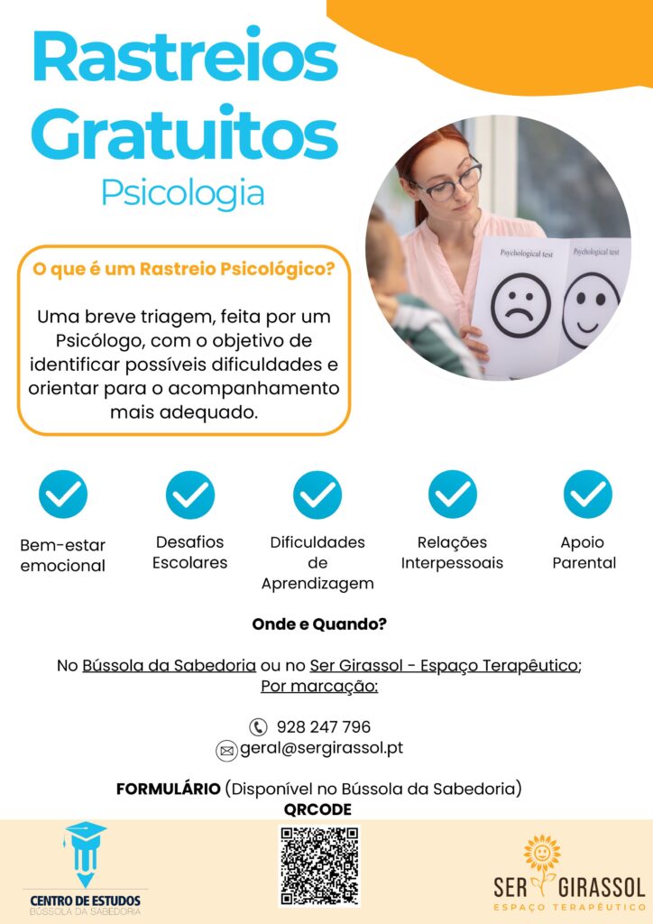 A Bússola da Sabedoria em conjunto com o Ser Girassol – Espaço Terapêutico disponibiliza rastreios gratuitos de Psicologia de forma gratuita!